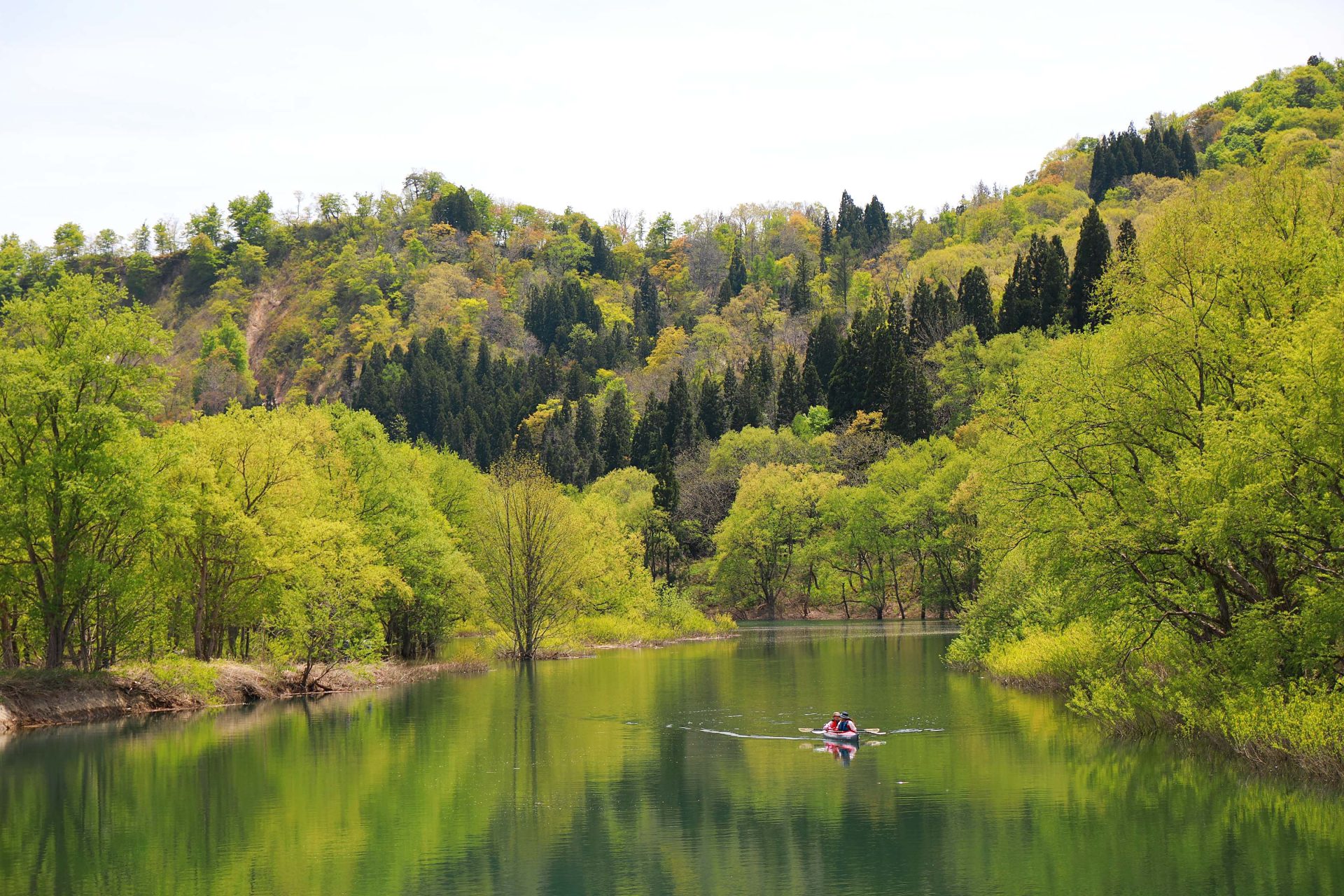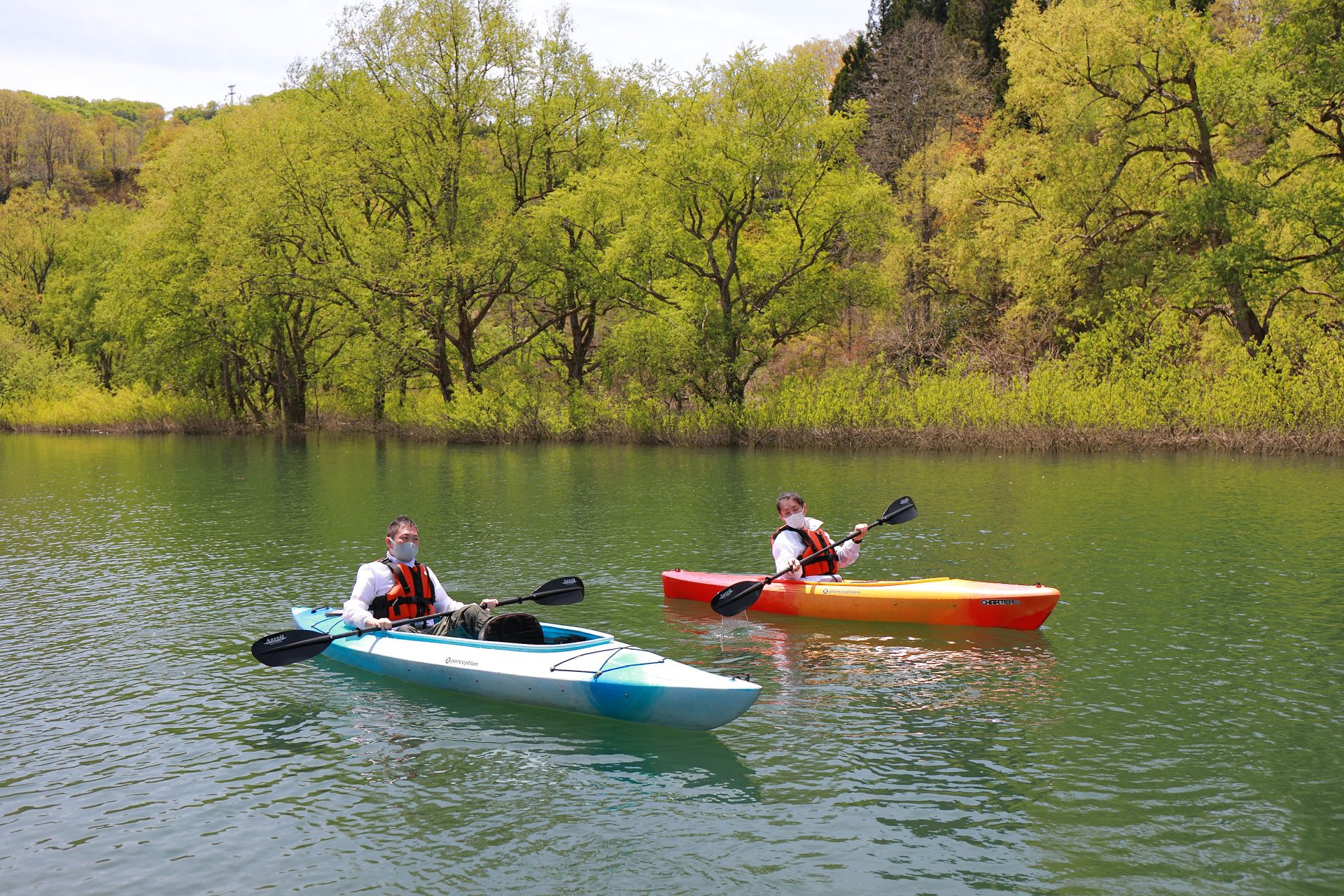 新緑の若葉眩しい飯豊連峰の裾野を目指し、山形市内から国道348号、さらには113号を駆け抜けて集まった「つくりばプロジェクト」メンバー。今回は春の雪解け水が満水になった白川湖を舞台に、春のわずか1ヶ月半ほどの期間限定でしか体験できない水没林カヤックにチャレンジするという。