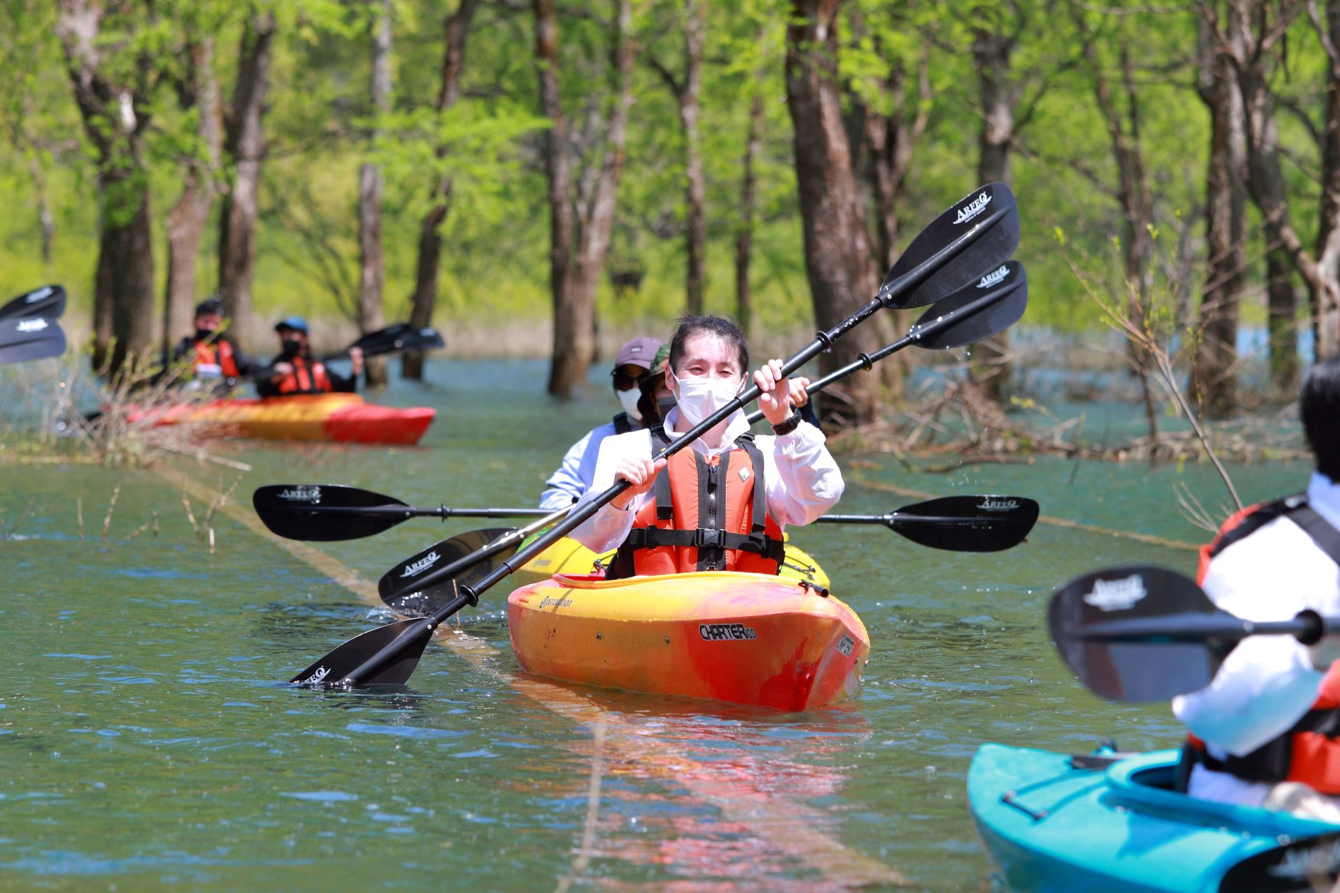 「前半はパドルの動きに苦戦しましたが、出発する頃にはカヤックにも慣れてきて、水上の風を浴びながら清々しい気分で乗れました。低い木たちは水中に沈んでいて、水面に透けて見える。その上をカヤックが走るというすごく面白い体験ができました」と、普段は見られない特別な景色と湖上の水遊びに心が動いた様子。