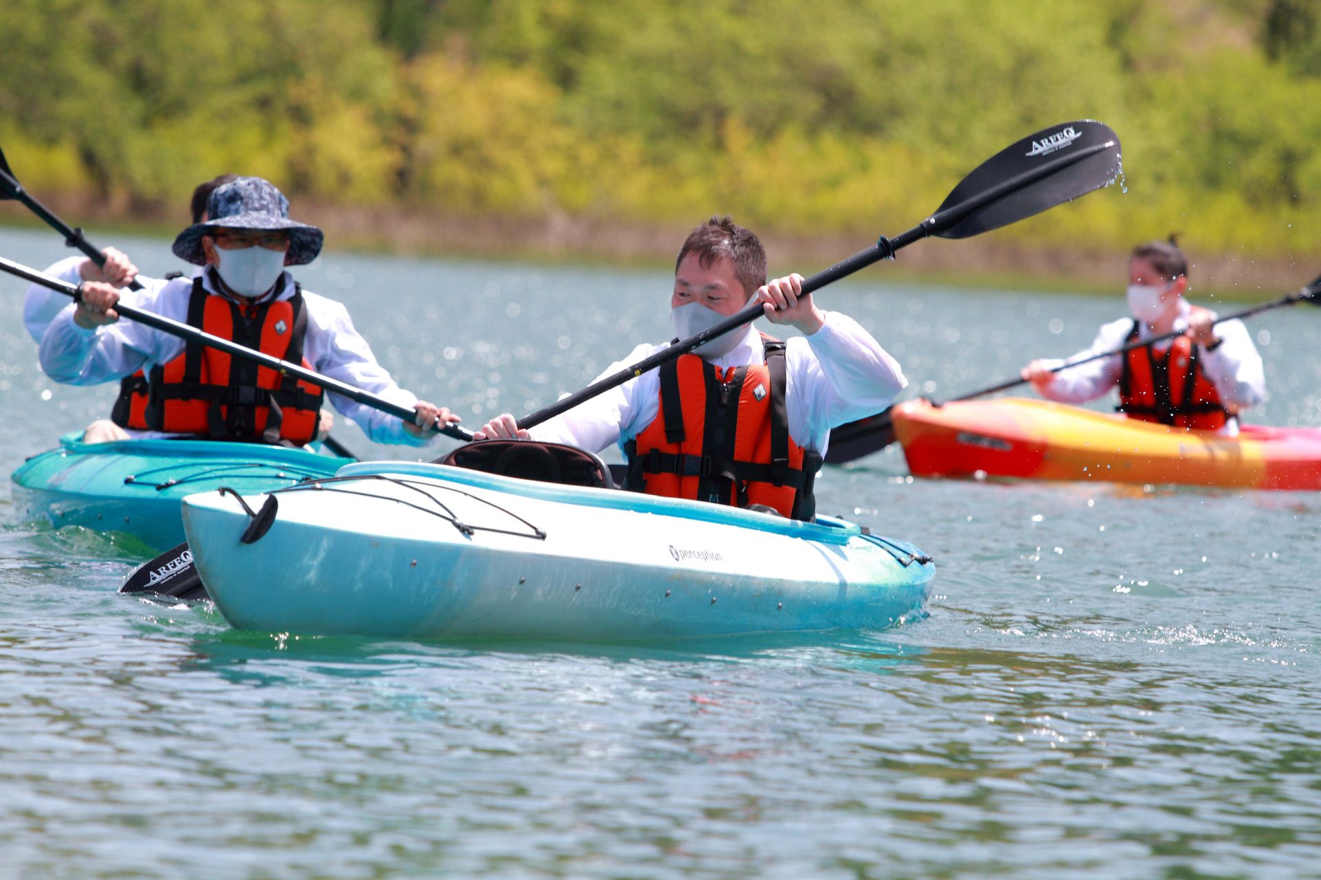 「体験教室を初めてから、カヤックをひっくり返したのはこれまで5人います。くれぐれも湖の底にいる河童に引きこまれないようにね」と笑顔で話すインストラクターの言葉に動揺しながら、いざ入水。