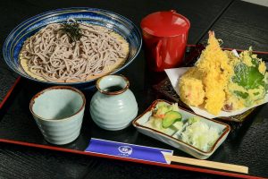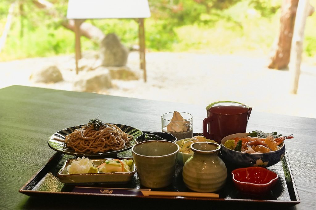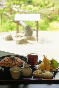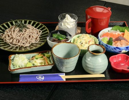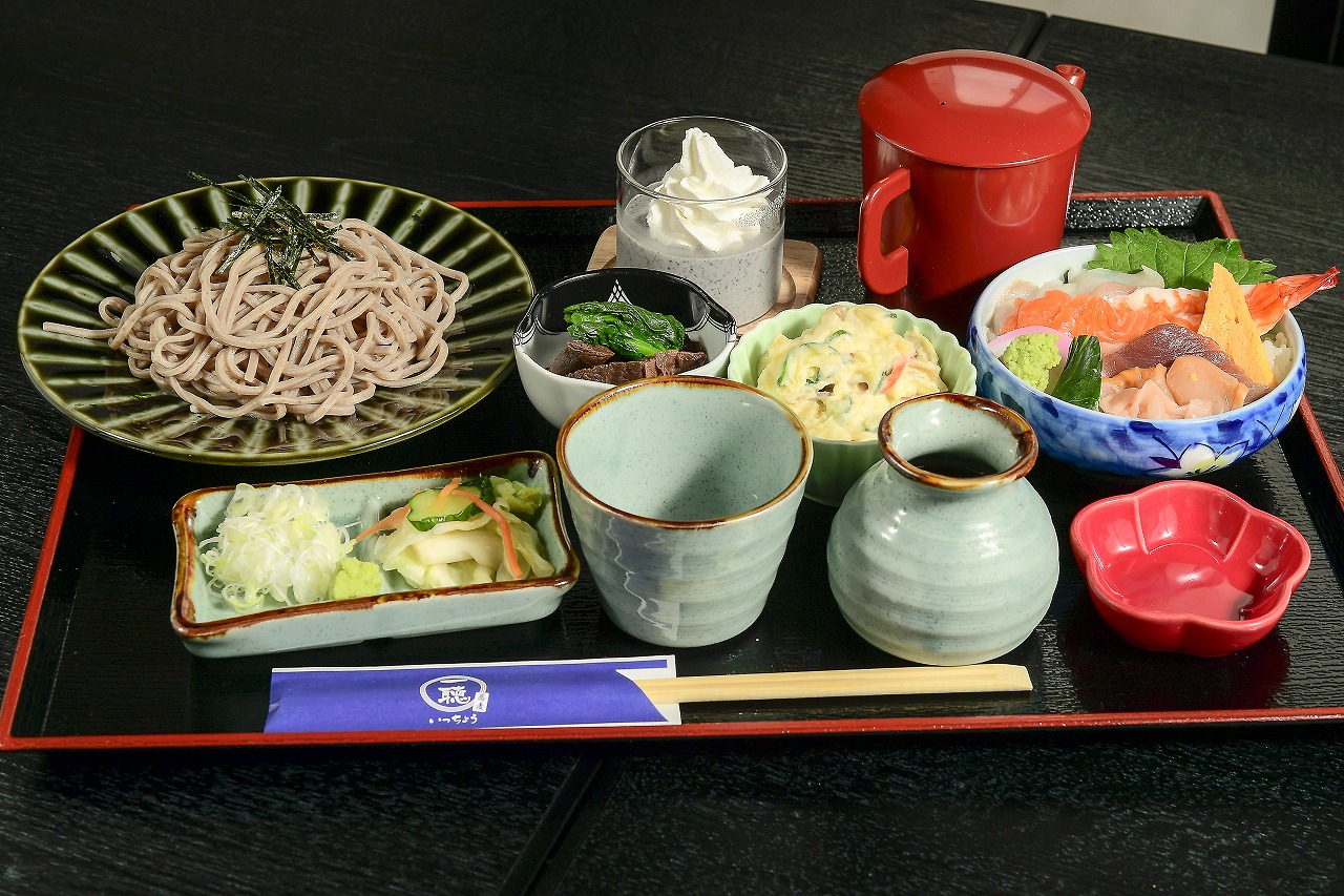 普通盛りのざる蕎麦にご飯物が付く「一聴セット」も好評です。ご飯物は、季節により変わります。取材時(夏期)は写真にあるミニ海鮮丼でしたが、秋期はオリジナル天むすになっています。「わざわざここまで来てくれたお客様への感謝の気持ち」と、「華やかさも出ますから」と笑顔の宗片さん。