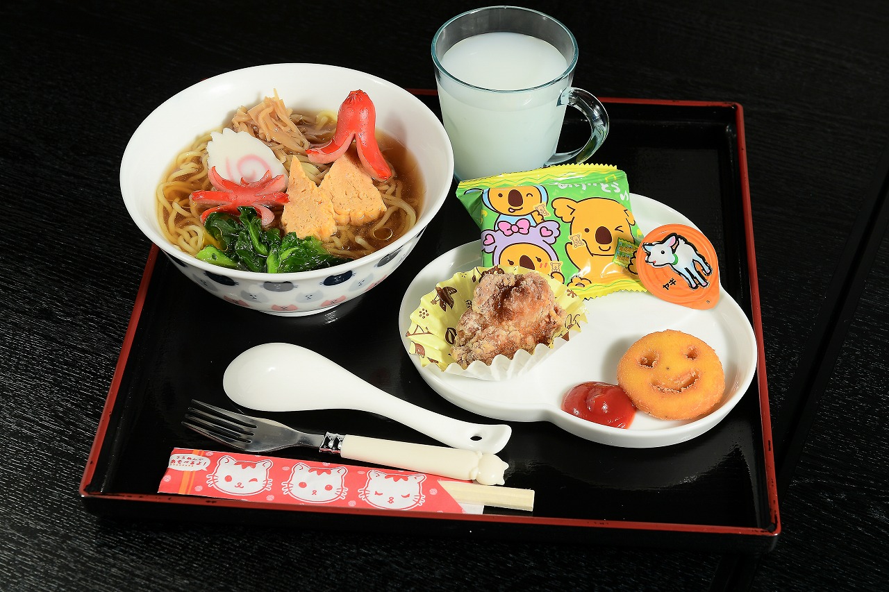 さらに助かるのが「キッズメニュー」。キッズラーメン(温かい中華そば)におかず2品、デザート、ジュースまで付いたセットで、ミニざるそばへの変更も可能です。「アレルギーなどありましたら、気軽にスタッフにお知らせください」とのこと。家族で利用する場合、やっぱりキッズメニューはあると助かりますね。