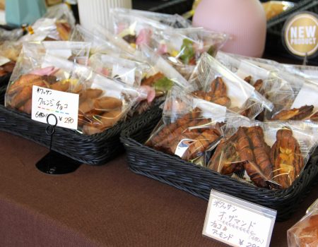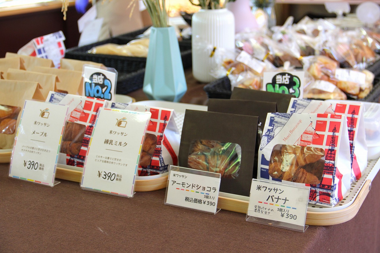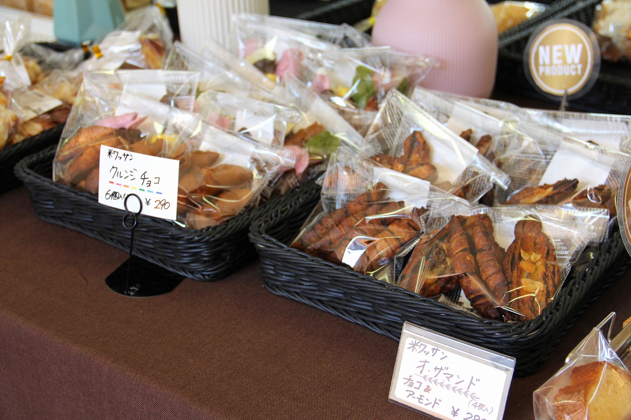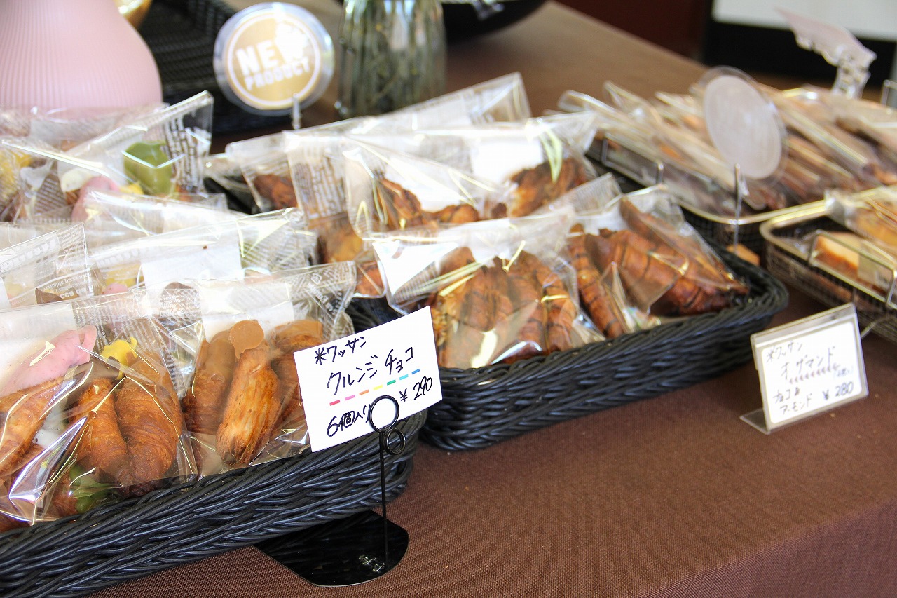 店頭に並ぶパンはすべて米粉パン。定番の食パンやクロワッサン風の“米ワッサン”、そして惣菜パンなど種類も豊富。さらに、クッキーやシフォンケーキなどのお菓子にも米粉が使われています。