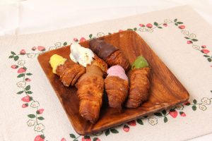 この「米ワッサン」をカットし、冷凍してから再び低温で焼き上げたのが「米ワッサン クルンジチョコ」。イメージは、クロワッサンのラスクです。抹茶やイチゴなど6色のチョコで彩られていて、見た目も華やか。価格も手ごろなので、お子さんのおやつにもぴったりですね。