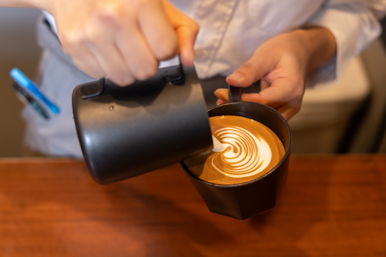 カフェラテにはバリスタによる可愛らしいラテアートが描かれます。バリスタは3名ほど在籍し、カウンターでデザインする姿を見ることもできます。「撮影されると緊張するので、一声かけてもらえると嬉しいです。」と小林さん。思わず写真に収めたくなる瞬間です。