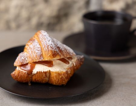 クロワッサンは店舗で生地から手作りしています。バターを贅沢に使用した香り豊かなバリバリ食感のクロワッサンです。写真の「生キャラメルクロワッサン」は、自家製の生キャラメルクリームとほろ苦い生キャラメルソースで仕上げてあります。