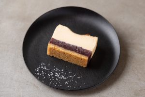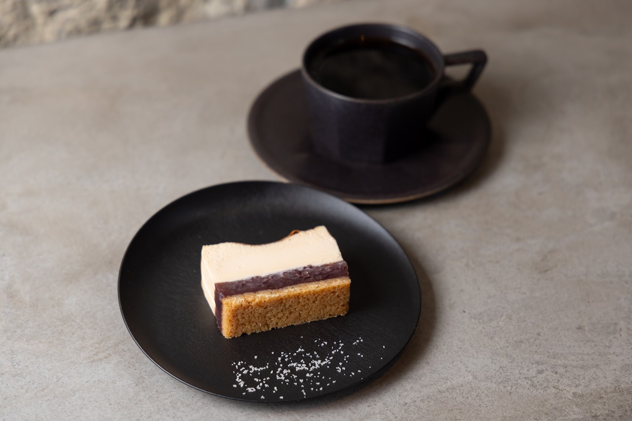 お店の看板メニューでもある「あんチーズ」は、3種類のチーズをブレンドしたチーズ生地に、『榮玉堂』さん自慢の粒あん、そしてバターを贅沢に配合したサブレが三層になったスイーツ。一口食べると、チーズのまろやかさとあんこの優しい甘みが絶妙にマッチ。甘さ控えめなので、塩をアクセントにするとさらに深みが増します。