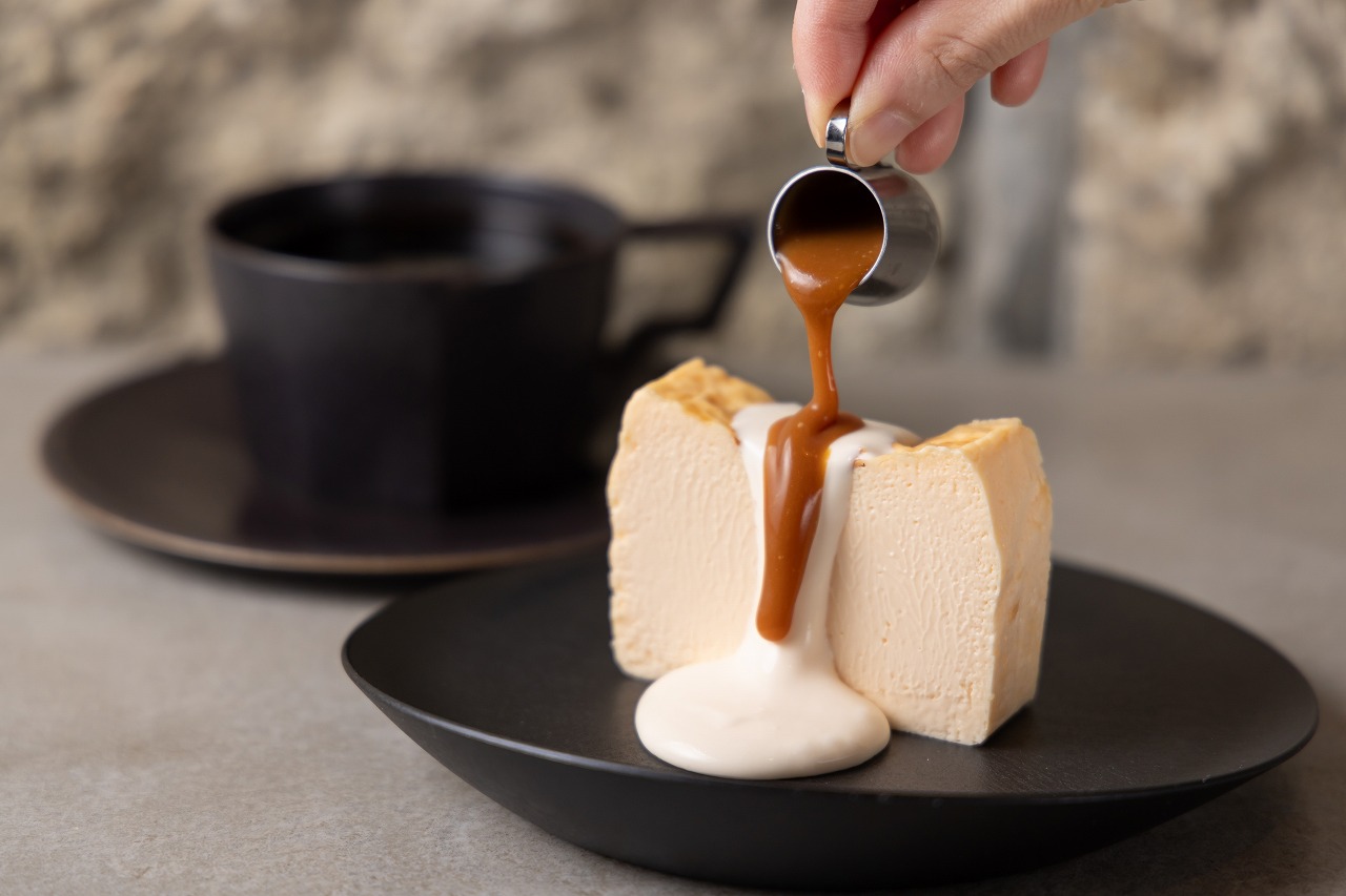 店内で食べられるグランドメニューの中でも人気なのが「チーズテリーヌ」。3種類のチーズをブレンドしたこだわりのチーズテリーヌ。独自の製法で濃厚に焼き上げています。写真は「生キャラメル×チーズテリーヌ」。濃厚なチーズテリーヌの上にマスカルポーネクリームをのせ、自家製生キャラメルソースをかけていただきます。