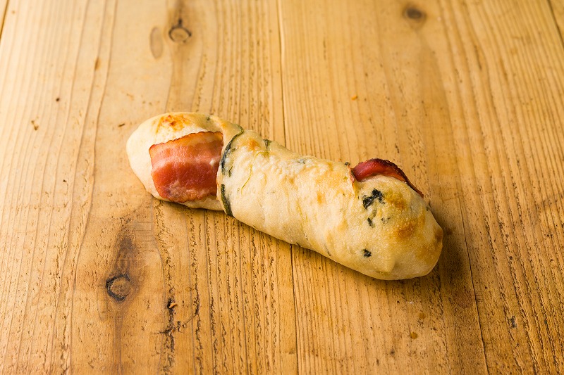バゲット・トラディションの生地で、ベーコンとほうれん草、チーズを巻き込んで焼き込みました。まるでチーズフォンデュを食べているような、シンプルながらにリッチな味わいが魅力です。